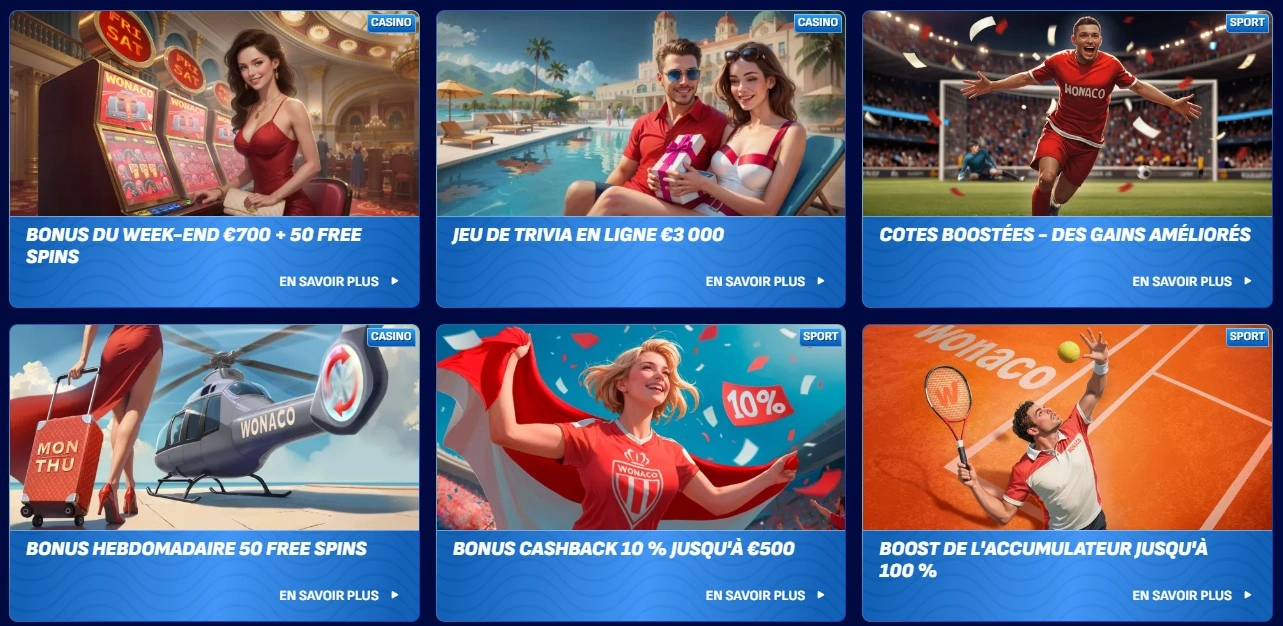 Grâce à son catalogue étendu et à ses promotions avantageuses, Wonaco Casino se positionne comme une référence pour les amateurs de paris sportifs en ligne.